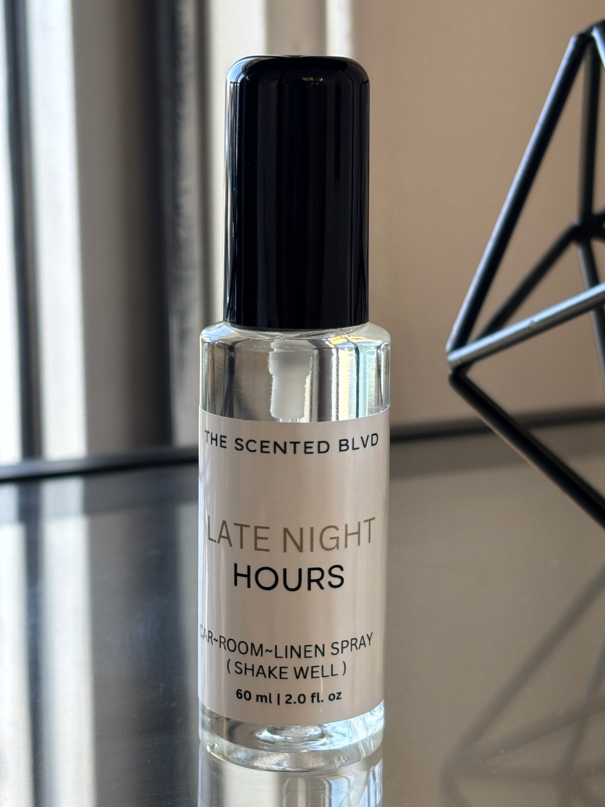 Our Late Night Hours Room and Linen spray is a signature blend of cyclamen, cashmeran and geranium on a background of amber and sandalwood.